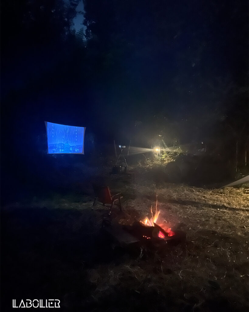 火熾しをし、焚火の傍へ。プロジェクターを設置し、映画を鑑賞。