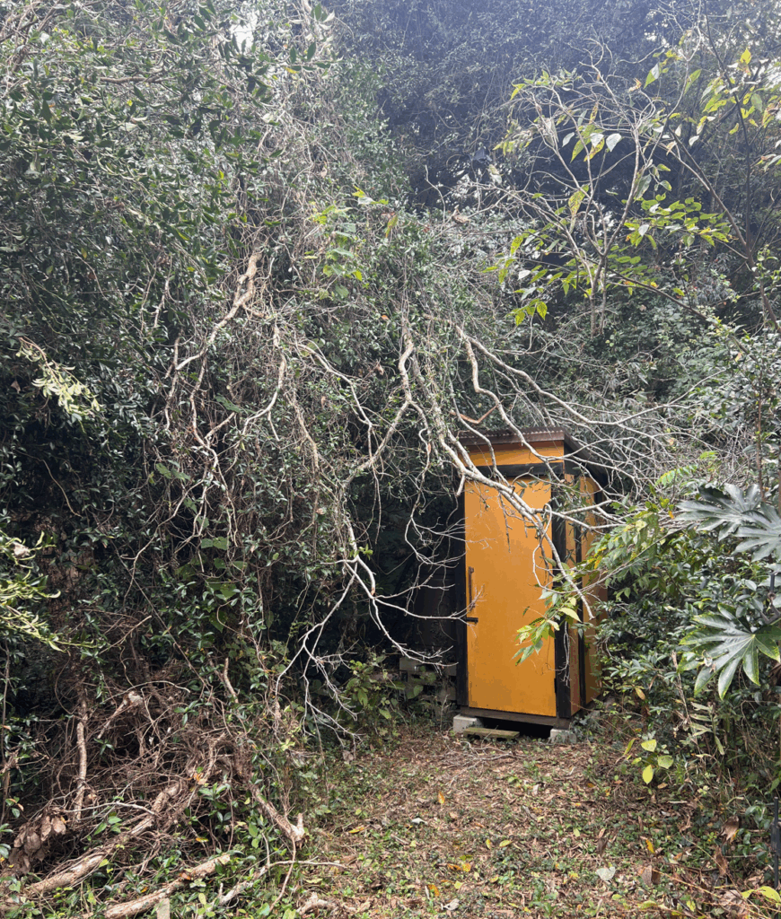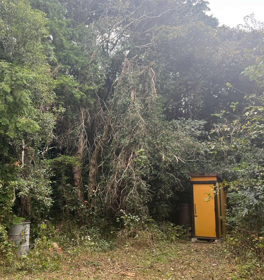折れた木は、蔦が絡み合っていて除去することができない。なんとかトイレの近場だけ片付けた。