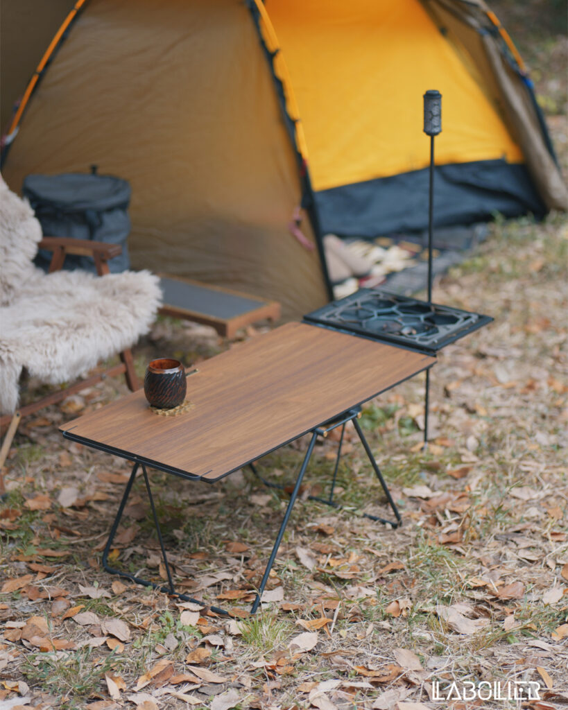 NODEL DESIGNの「Butterfly TABLE M」。金沢へ遊びに行ったときに、CAN FEELというお店に立ち寄って、見つけた商品だ。フラットバーナーを取り付けるオプションも、一緒に揃えた。