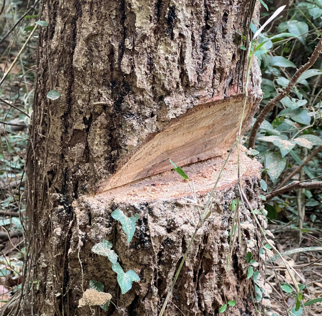 倒す方向は、「受口」というもので決まる。これを切った方向に、木は倒れる。慎重に方向を定めて、受口をつくる。