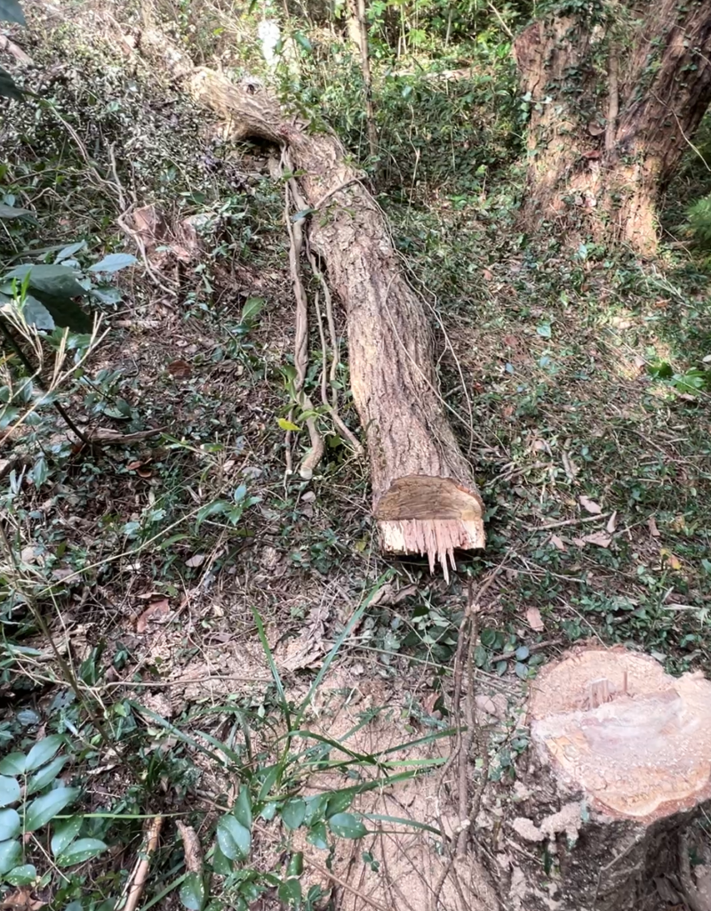 チェーンソーが木の幹の半分以上を切った時に、ミシミシという音が途中からし始めて、そして倒れていった。