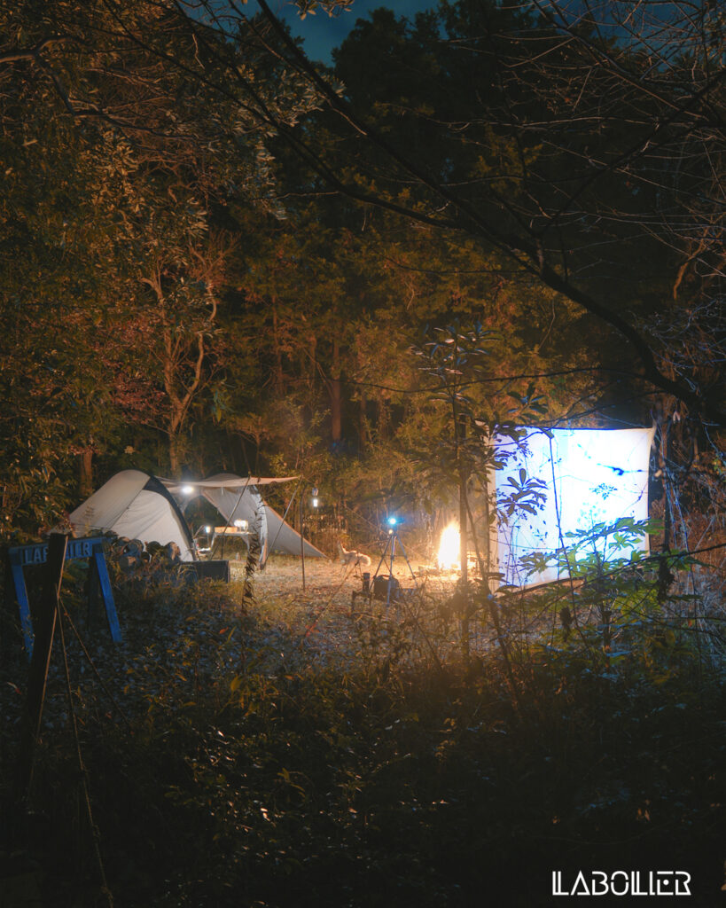 食事をした後は、もう、ゆっくりする。焚火をしながら、プロジェクターで映画鑑賞。