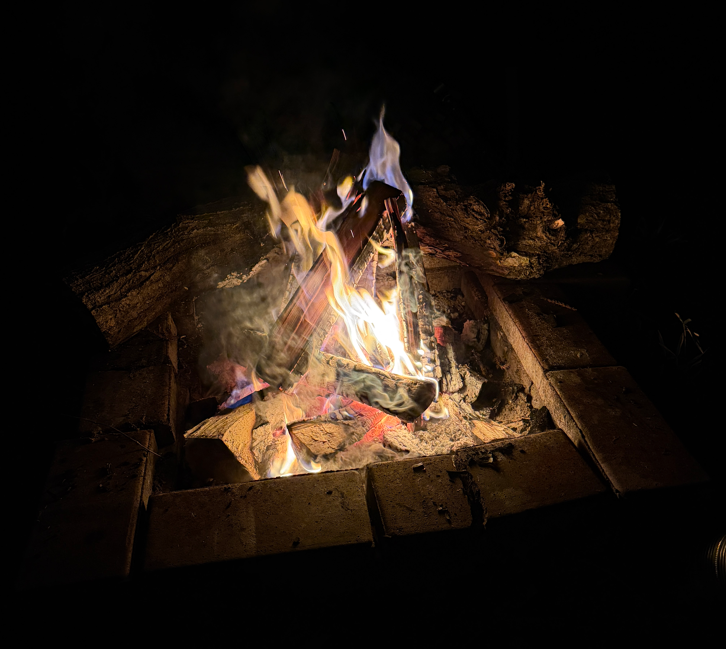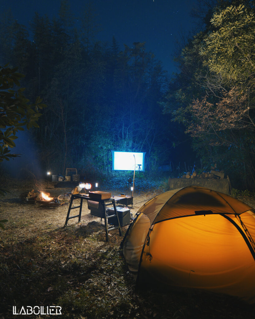 陽が落ちて暗くなったところで、焚火とアウトドアシアターを楽しむ。