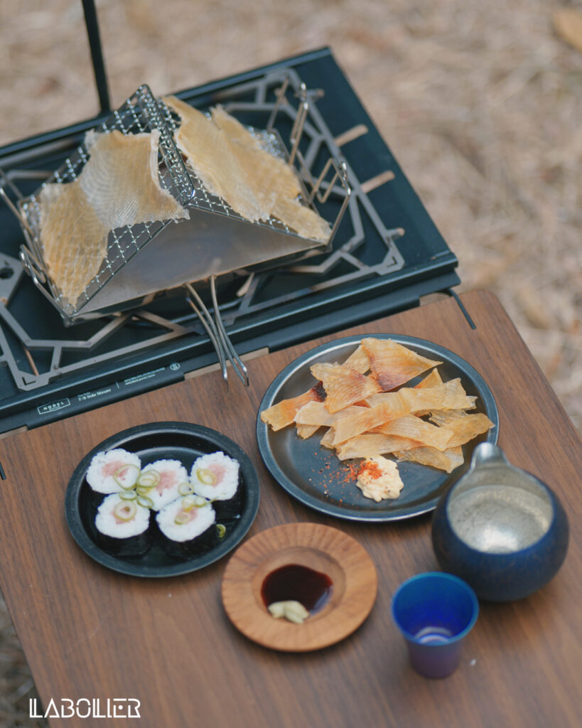 ネギトロ巻きと、エイヒレの炙り。ユニフレームのトースターでエイヒレを炙り、マヨネーズ+七味唐辛子をつけて頂く。夜ごはんもあるので、量は少なめに。