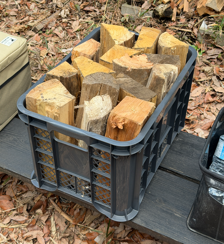 昼食と薪を買いに、少し外出。薪を買って持ち運ぶのに困っていたので、ホームセンターでコンテナを購入。これで運搬しやすくなった。