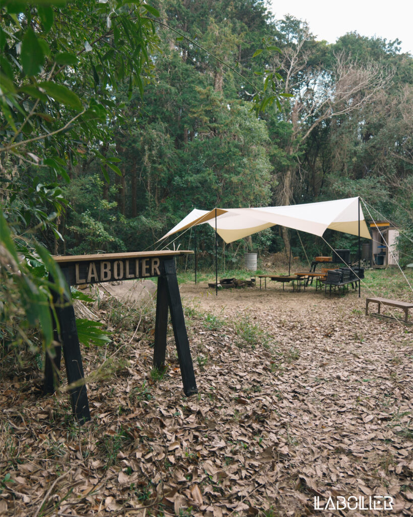 雨が降る可能性が捨てきれないので、タープを立てる。雨でも焚火は楽しみたいので、焚火場の上に。