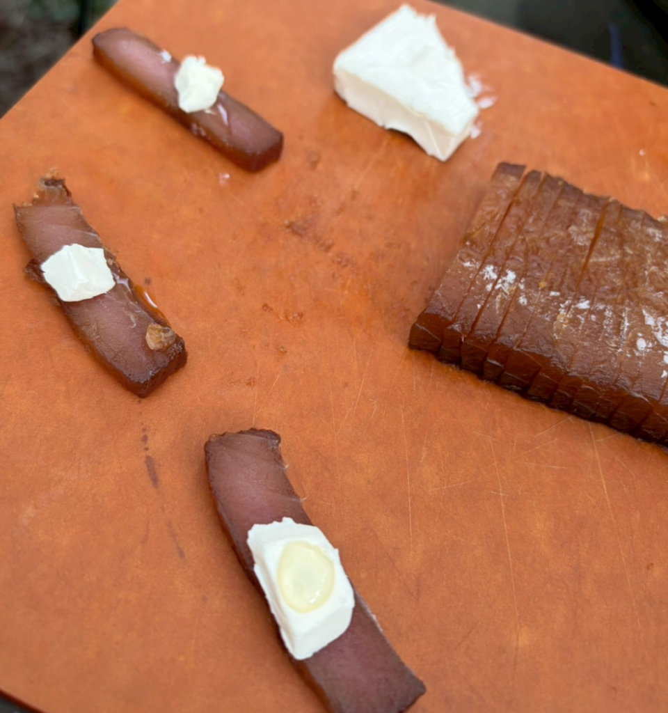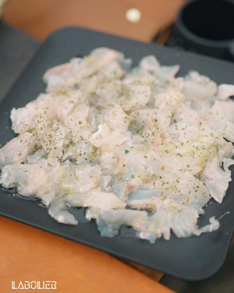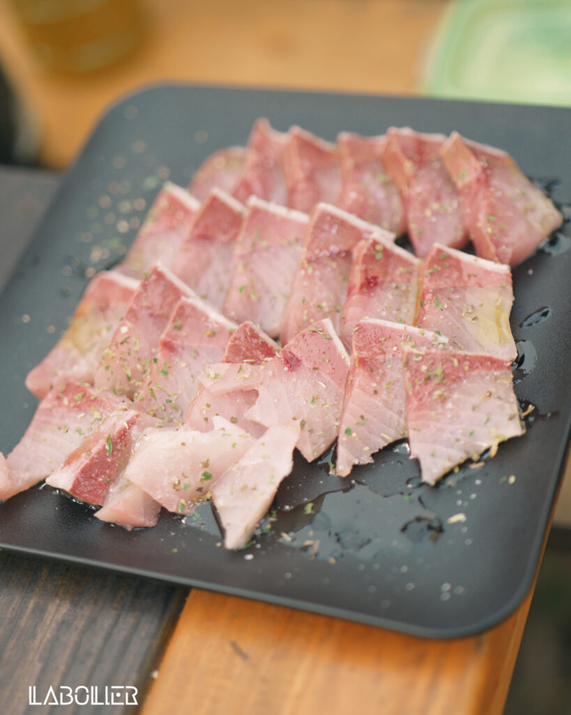 クリームチーズをのせ、山葵オイルをかけて、カルパッチョとしてみんなに食べてもらう。
