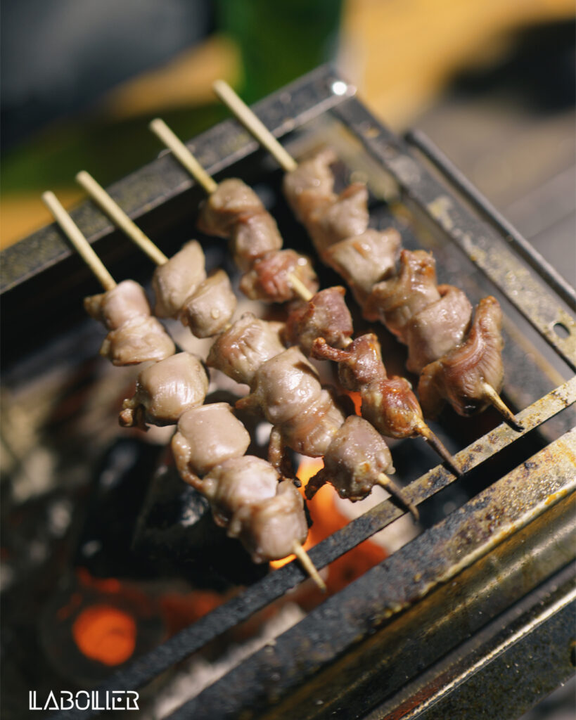 前回は火力が強すぎて、串が焼け落ちるなどしていたので、炭を少なめにして、ちょうどいい火力を探った。