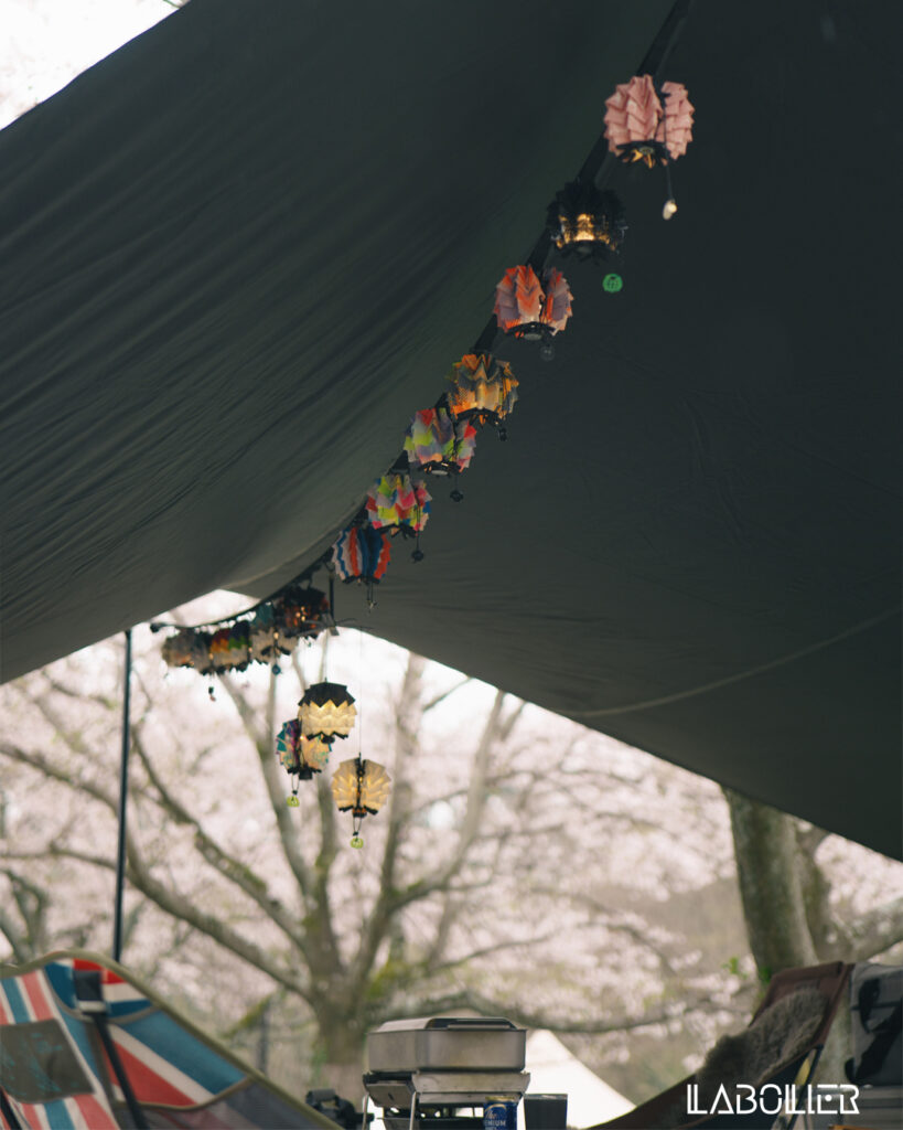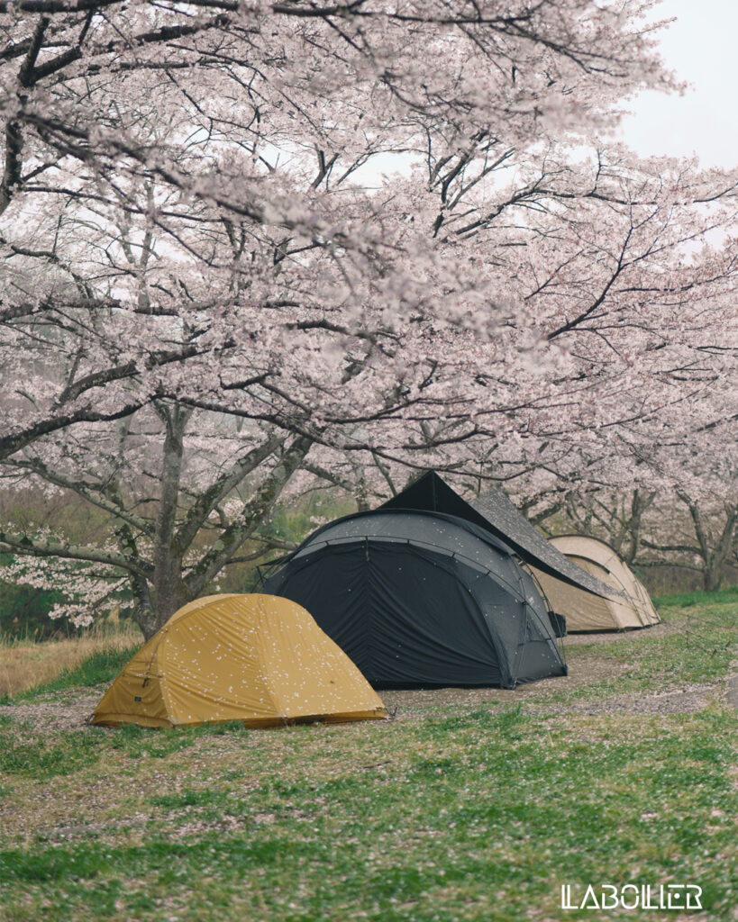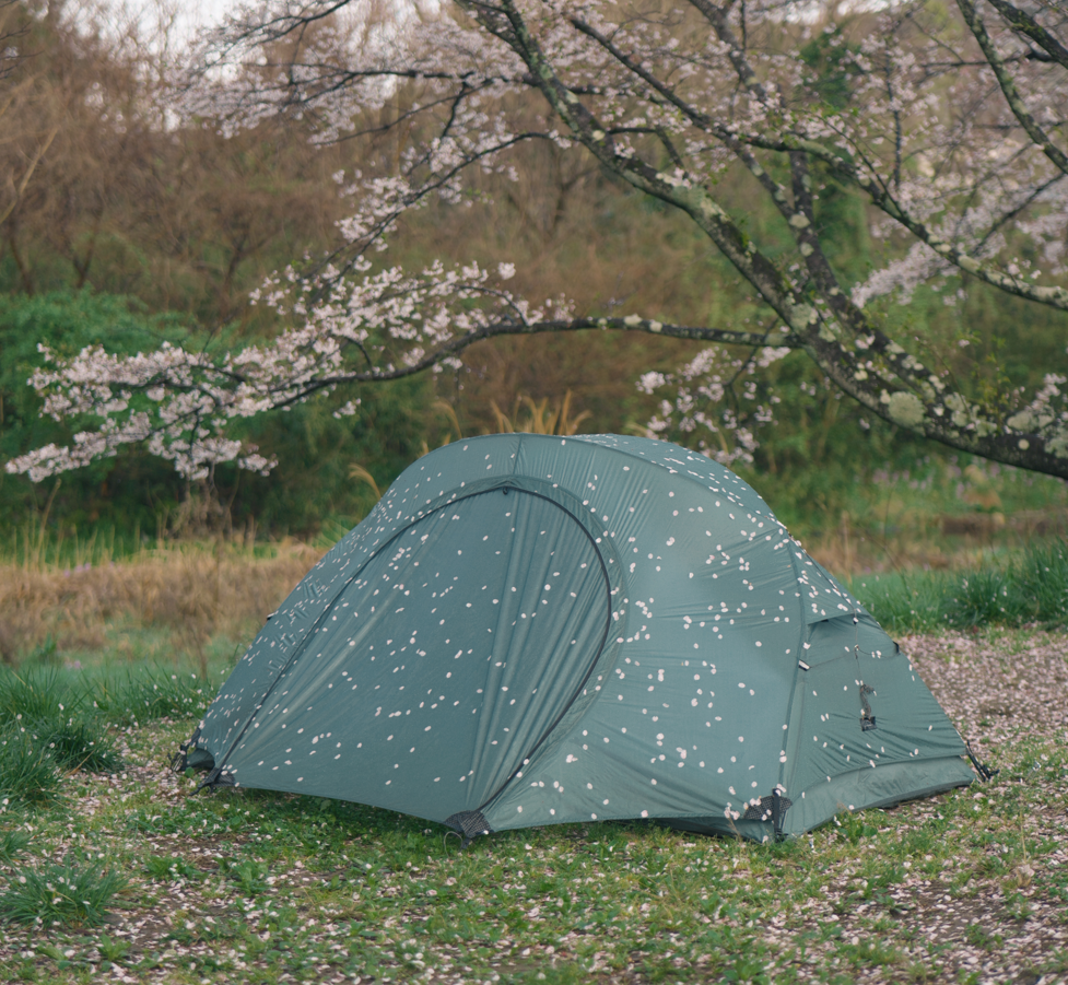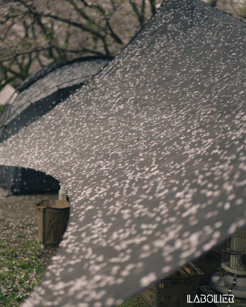 みんなもまだ寝ている中、ゆっくり撮影を。タープやテントに落ちてきた桜の花びらが、美しい。