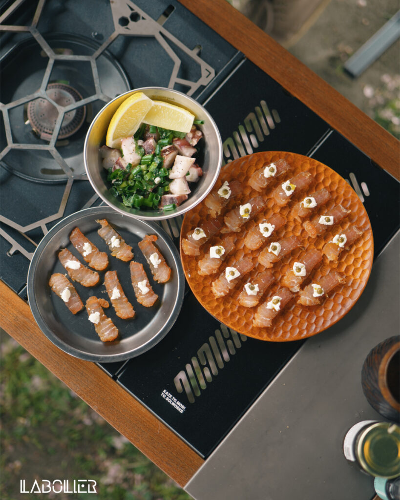 マグロの生ハムはよくつくっているが、日本酒に合うように、少しアレンジしてきたものだ。前回のキャンプでも試作をしたが、醬油麴で漬け込むのを試してみた。醬油麴で漬け込んだ後、塩と少量のスパイスをふって脱水シートで乾燥。