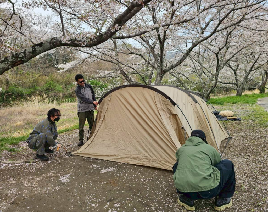 桜の下のサイトで設営